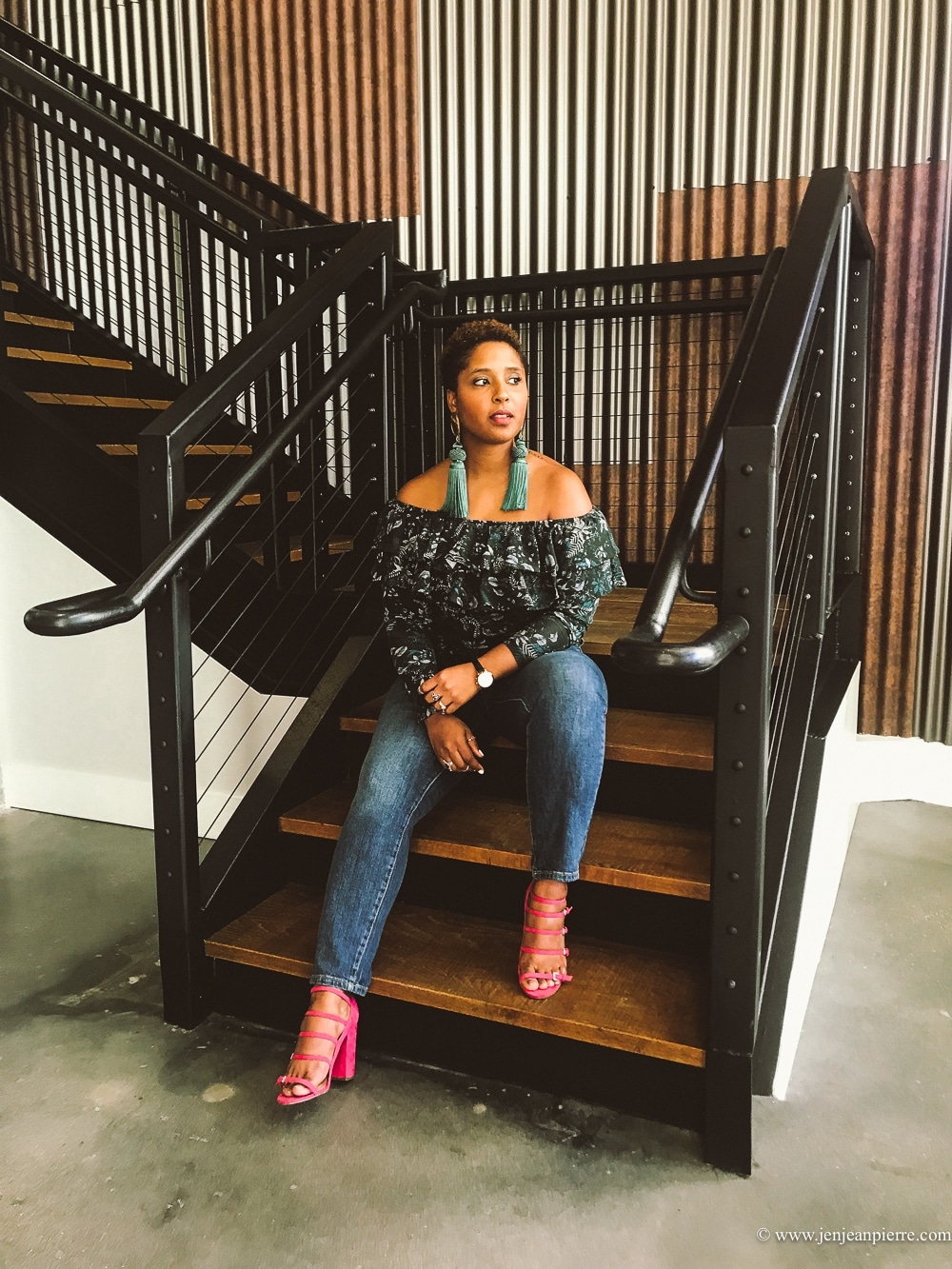 If you watch my insta-stories, you know I am currently OBSESSED with Target’s new denim line, Universal Thread. I chose to wear the high rise, straight leg pair in a size 12 (the size 14 that I own are my looser comfy pair) with a green floral print off shoulder ruffle top. To add a little spring to the mix, I donned my pink strappy ShoeDazzle Seidy sandals and off I went.
