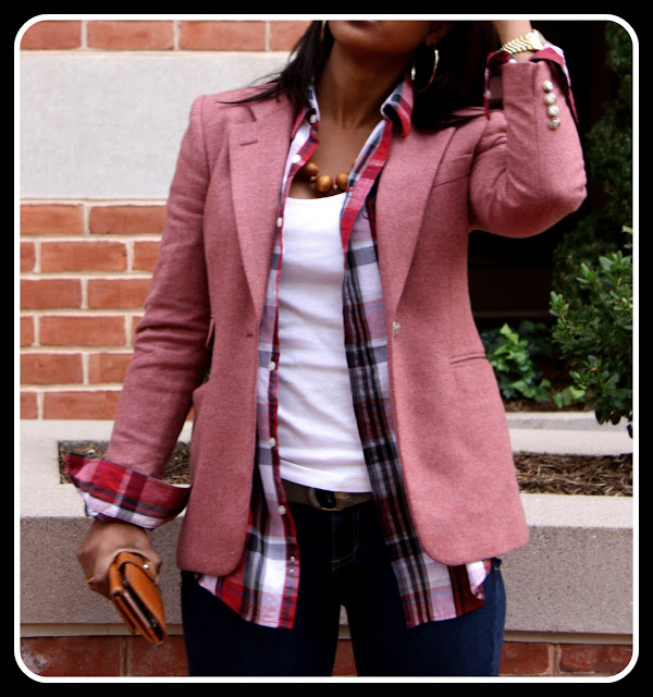 I love Fridays!! Not only is it the beginning of the weekend but its also casual dress day at work. Whoo hoo! Before I leave my place in the morning I always check the weather just in case. I am that chick dressing summery when its going to be 40 degrees out and then bundling up when its blistering out. Sigh! As you can clearly see, I am a huge fan of layers and layering. I think the last few posts, you could peel my clothes back like an onion cuz I wear so many of them… ah well, tis me. I love and I mean LOVE this Ralph Lauren wool blazer and wear it often in Autumn. Today I felt the fashion tug to wear it BUT needed to add a lil “oomph” or texture to it. I didnt have any shirts that could take on that task… then I looked in my other closet and BOOM, there it was beckoning me, pleading, taunting me saying “I got what you want, I got what you need”… my boyfriend’s plaid shirt!!!!! And ladies and gents, that is how this outfit came to be… enjoy!