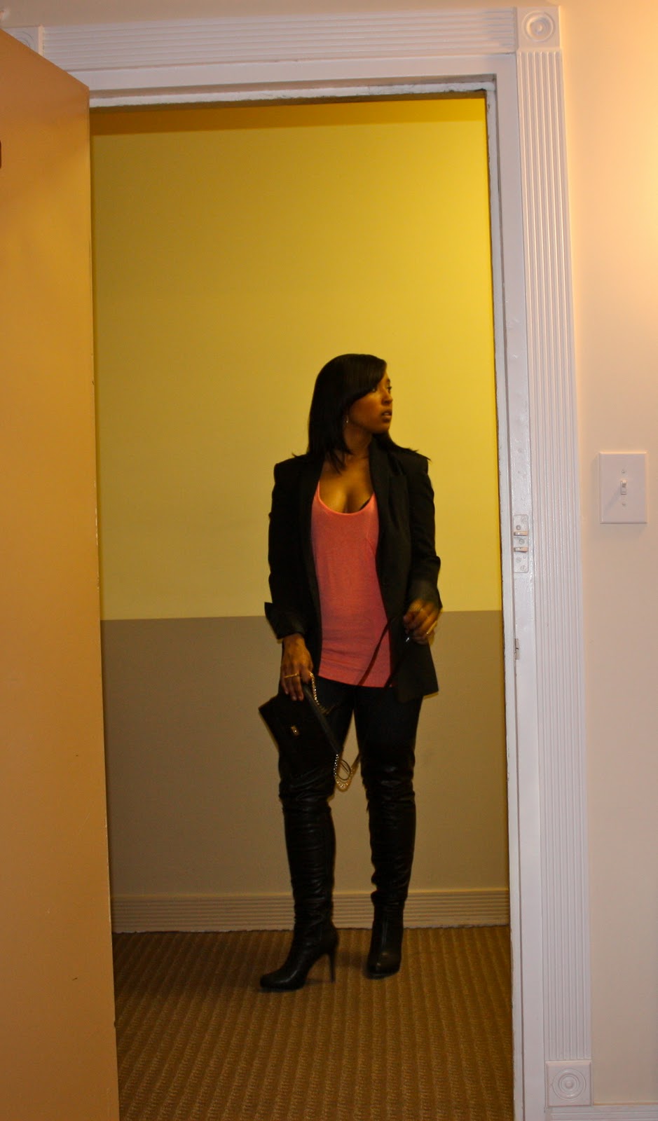 | Blazer: Norma Kamali, Coral Top: Charlotte Russe, Jean: H&M, Boots: Report, Bag: Liz Claiborne |