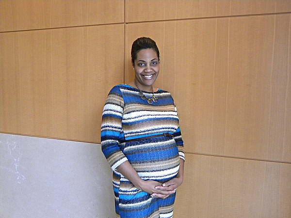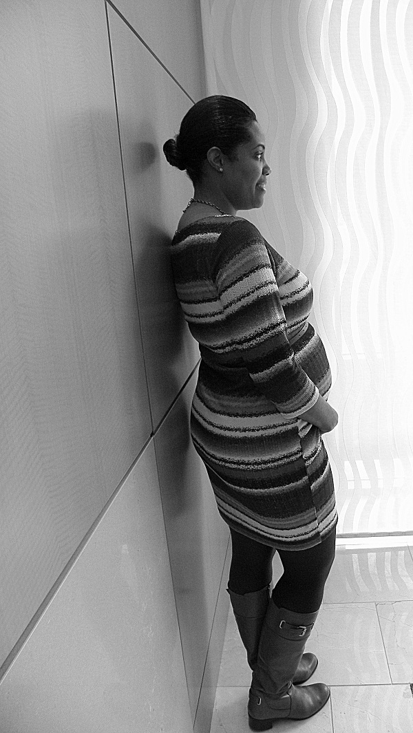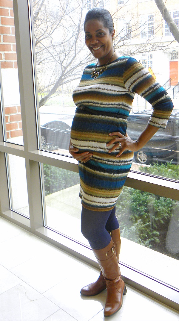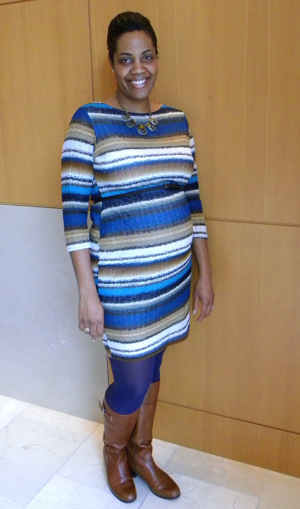 Being that I work at a non profit medical association, you would think my co-workers were conservative and boring dressers but that is so far from the case. Every day I run into women and men dressed to the nines or showcasing their individual style in the most remarkable ways. Today we had a very small gathering for those of us traveling to San Francisco for our Scientific Sessions and I ran into marketing guru and finance lady extraordinaire, Alisha Flachs. I have had the absolute pleasure of working with her in Orlando when I worked at the AHA conference, Chicago for the Annual Meeting and then Munich for the European Society of Cardiologist congress. I not only love getting work and life advice from her but I always adore what she wears. She is truly ladylike and often channels an Audrey Hepburn or a Jackie O. As you can tell from these pics, this absolutely beautiful woman is with child ( a boy, YAY!) but has a super stylish outfit on that anyone could pull off. I love that she wore opaque tights in an unexpected color to add a personal touch and I’m excited about her showing off her curves and baby bump in a form fitting sweater dress. Even though I didnt have my camera with me today I felt such a strong urge to post this real style on the blog that after seeing my excitement, she went on a mission to find me a camera to snap some pictures of her. I get really happy and giddy when someone just owns their look and I can see their personality shine through their outfit. We as bloggers tend to look like carbon copies of each other and all try to do things in order to become the next Leandra Medine blogger superstar and really all we need to do is be ourselves! I love seeing stylish women in my everyday life and I am happy that Alisha was so willing to allow me to feature her today. I can honestly say if/when I ever get pregnant, I really hope that I have the energy and motivation to beautify myself as well as she does. Thank you Alisha for being such a pleasure to work with and photograph! Oh and did I mention, I felt her baby kick today… first time EVER in my life I was able to experience that… aahhhh fashion and the wonders of nature, what more could you need on a Wednesday???
