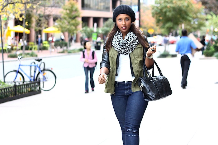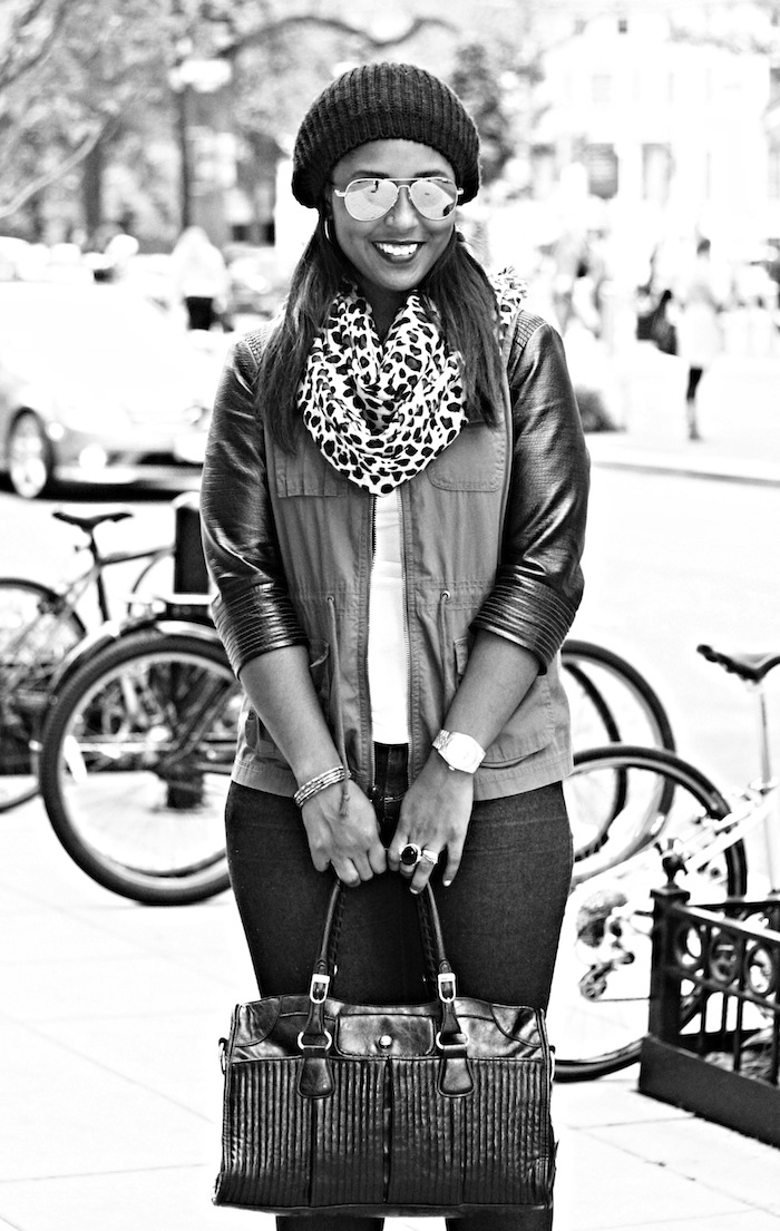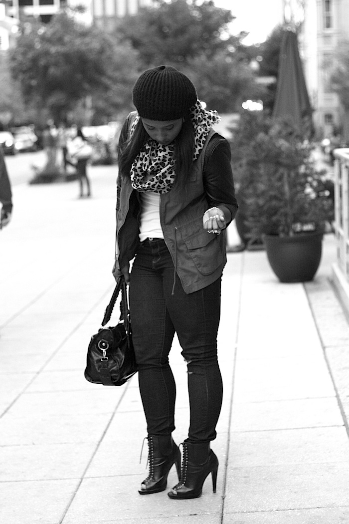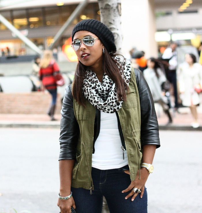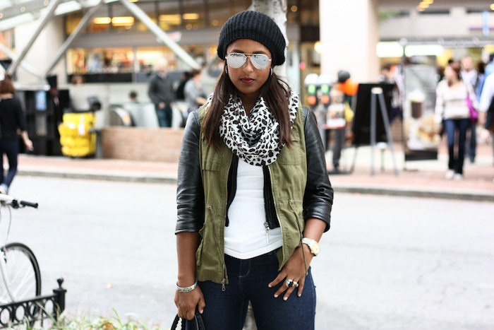 Textured Fall Layering w/ Leather Sleeves and Military Vests