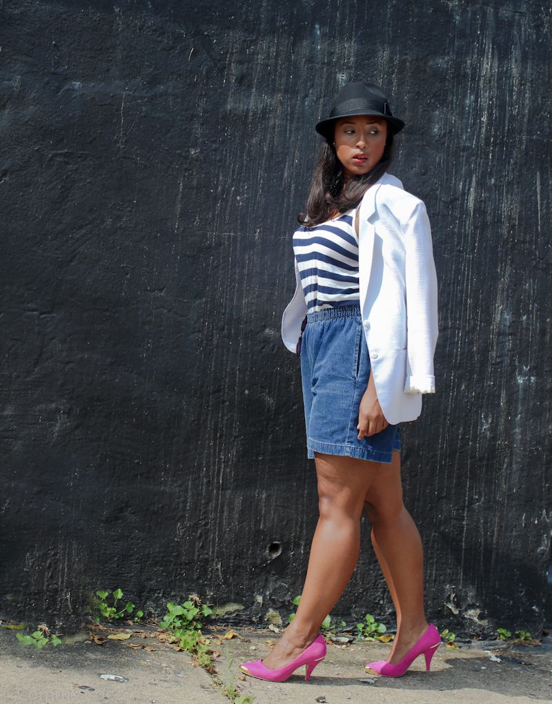 When I go thrifting, I rarely take an item at face value. For me it is all about the possibilities and potential of that given piece. I rarely thrift for things that I would typically purchase at a conventional store and instead look for items I would never go buy. When I went to the Goodwill in Catonsville, I came across these “mom jeans” type shorts and gravitated to them. They have a full leg, elastic waist (yes you read that correctly), and pockets. Because I have luscious thighs, I don’t love slim cut shorts. I will wear them if needed but I dont like anything to be sausage casings for my thighs. I usually wear these around the house when I am having a fat/bloated day but decided to pop these on to grab sushi with a good friend. I knew I would be sipping on bubbly and gorging on sashimi and rolls so I neede the extra room. Paired them with my favorite white blazer, stripes, vintage round sunnies and a pop of color on my feet and I was ready to go!