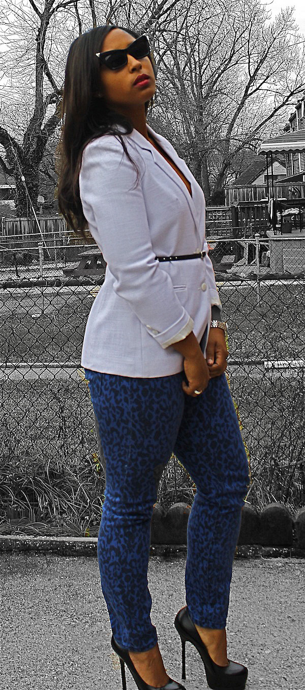 I already know that my mother is going to chastise me for this outfit being the wonderfully conservative lady she is but dont fret my favorite woman on the planet, I have a shirt on with this blazer so please do not yell at me. (heehee). Since I was young I have been obsessed with breasts. My mother and grandmother have vivacious twins and I completely embody my biological father’s gene pool when it comes to my body. In my 20s, I wore 2 push up bras at a time to get va-va voom cleavage and looking back, they looked RIDICULOUS! Now that I am in my 30s and more in-tune with who I am, I am happy for my subtle yet sensual ta-tas. Every now and then as a woman you have to remind yourself that you are still sexy and you still “have it”. (peep the current issue of GQ magazine to see what I mean). This outfit makes me feel like I have “it” and then some! I initially paired this blazer with a sheer white tank but it did nothing to match the mood I was in at the time so I snatched it off, threw on my deep-v bodysuit and went on my merry way. As much as I love wearing black, there is something equally powerful about a crisp white jacket. As previously mentioned I was not blessed with an hourglass shape so cinching at the waist is almost a “must do” for me when wearing anything boxy cut. I wanted my cleavage to speak volumes so I left my neck bare, added statement sunglasses that I purchased months ago, a watch, my braille ring, leopard skinnies and my beloved YSL TribToo pumps….
